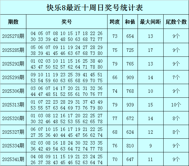 福彩自在8第2025341期(上周日)回来:04 08 09 11 15 19 21 23 24 25 26 37 38 43 45 46 52 63 64 74,其中奖号首尾间距为70,和值为647,最大间距为11,余数分辩为:余数0包含0个号码,余数2、7包含1个号码,余数1、6、8、9包含2个号码,余数3、5包含3个号码,余数4包含4个号码。
